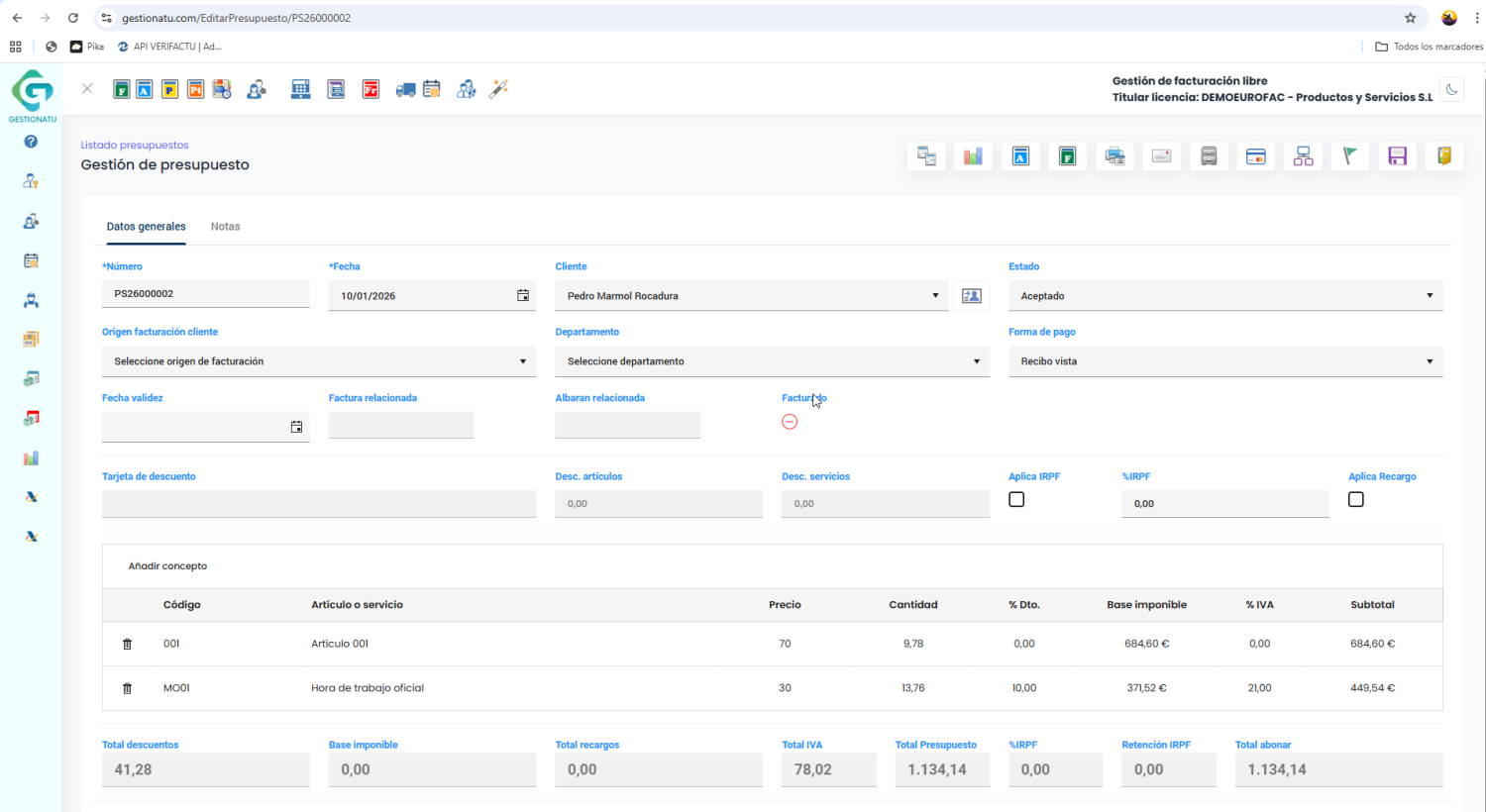 El sistema permite convertir fácilmente un presupuesto en albarán o factura, agilizando el proceso de venta y evitando duplicar tareas. Además, puedes enviar los presupuestos directamente por email al cliente, mejorando la comunicación y la imagen profesional de tu negocio.