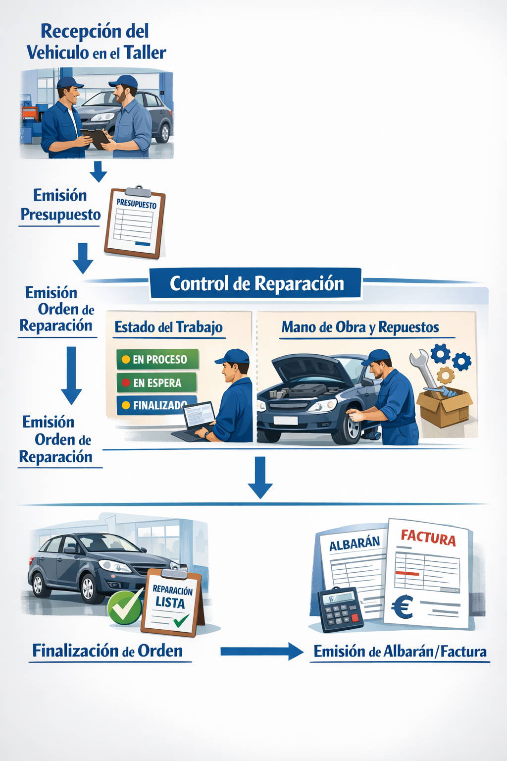 Para el dueño del taller, esto se traduce en un ahorro de tiempo enorme, menos errores en presupuestos y facturas, y una gestión mucho más ordenada. Además, entregas al cliente documentos claros y profesionales, con el detalle de las reparaciones realizadas, lo que mejora tu imagen y genera más confianza. En resumen, una herramienta sencilla pero potente para que tu taller funcione como un negocio moderno y bien gestionado.